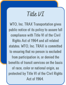 The Public Transportation program, commonly known as TRAX, provides professional, cost effective, coordinated passenger transportation services to the general public in the non-urbanized areas of Texas using the most efficient combination of financial and other resources. The WTO,I governing board administers this non-profit entity known as the Permian Basin Rural Transit District, established in 2003 by the Permian Basin Regional Planning Commission, and recognized as a political subdivision of the state WTO, Inc. subcontracts with the Family Crisis Center of the Big Bend for the provision of public transportation services in the Big Bend area.